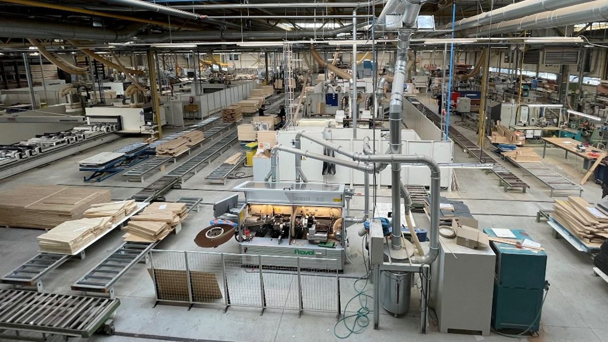 The central vacuum system is installed on a raised balcony above the production floor, overlooking the CNC routers. Since 2018, an additional two CNC routers have been added to the production line and connected to the vacuum system. The MINK vacuum pumps have a regular working day along with the employees, operating eight hours per day, Monday through Friday.